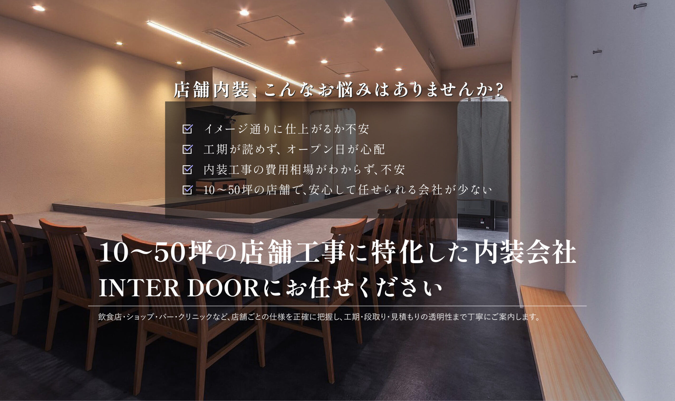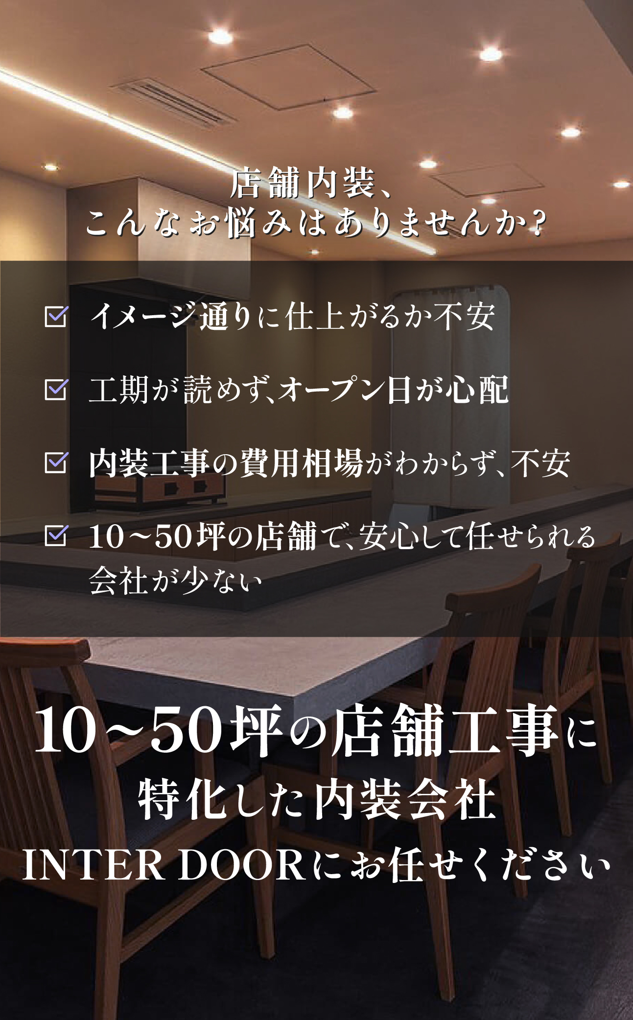 INTER DOORでは、10〜50坪の店舗工事を多く手がけており、この規模に最適な体制で、安心してお任せいただけます。