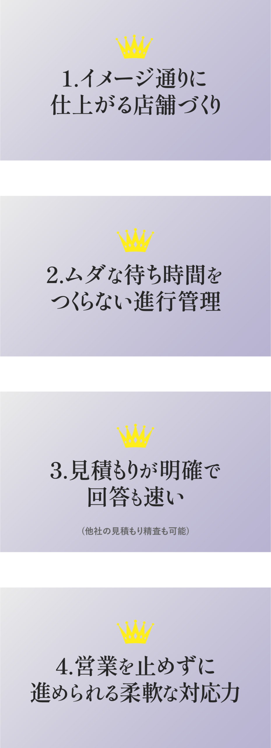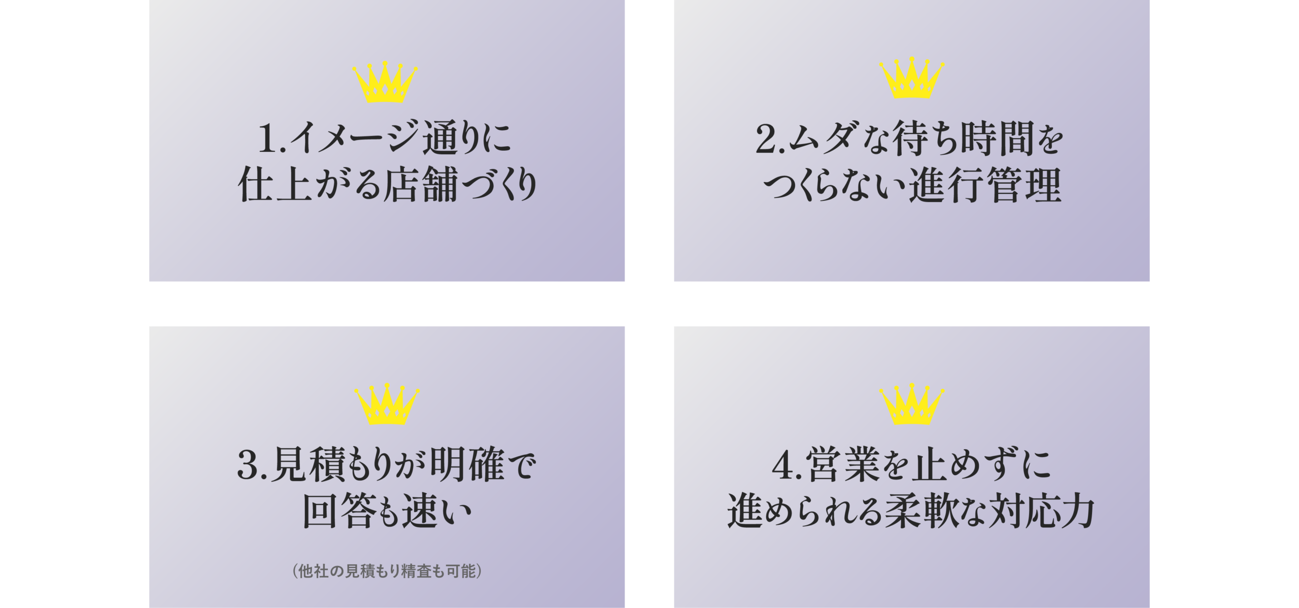 以下の4つの理由により、初めての店舗づくりでも安心してお任せいただけます。